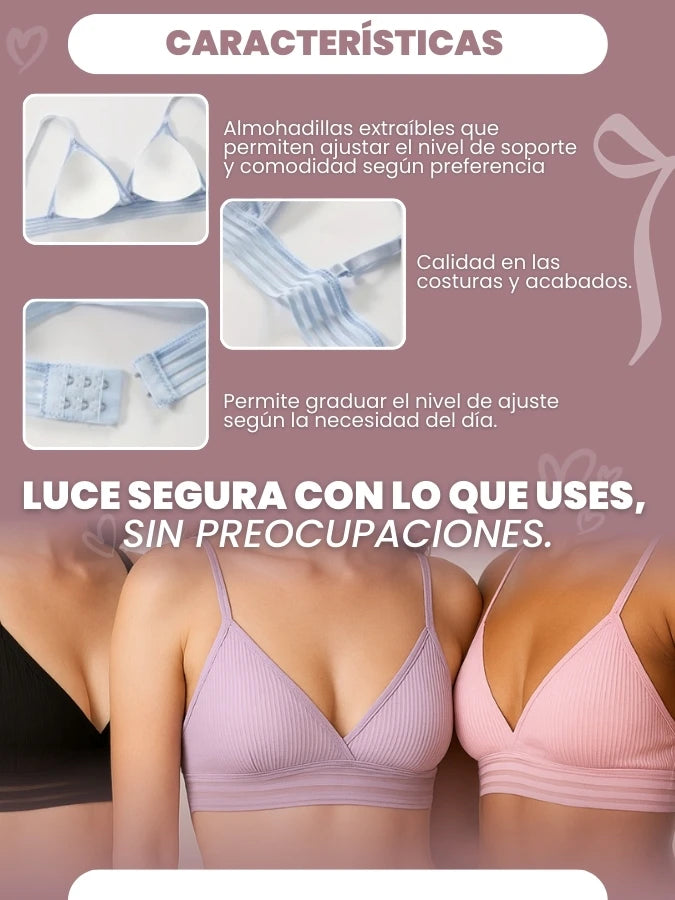 Zendra™ incluye almohadillas extraíbles, para que elijas entre más soporte o una sensación ligera y natural según tu preferencia.