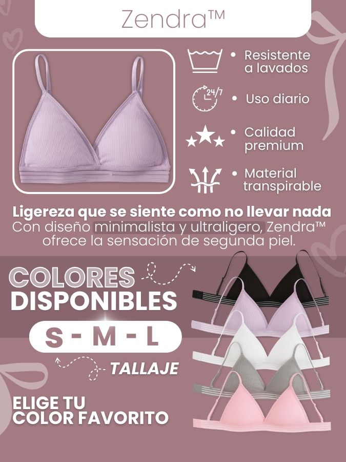 Actualmente ofrecemos Zendra™ en 5 colores (negro, blanco, rosado, lila y gris) y en 3 tallas: S, M y L, pensadas para adaptarse a la mayoría de mujeres.